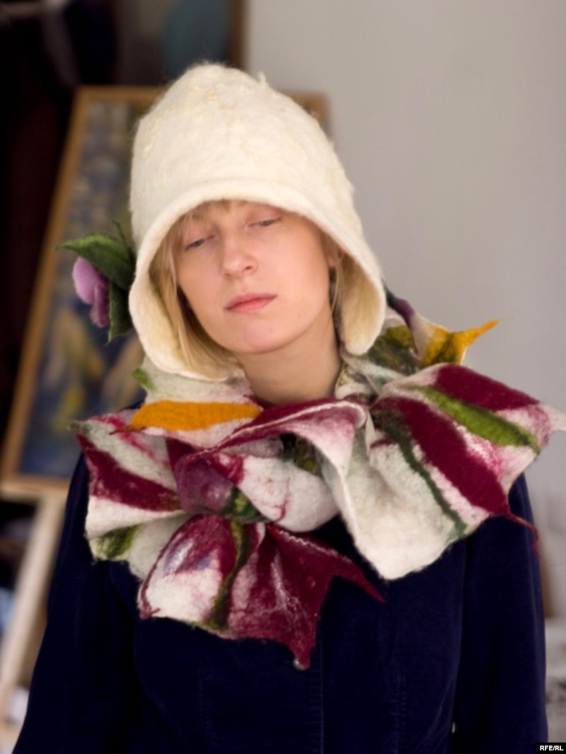 Тацяна: “Прыемна, што там спалучэньне ўсяго – і колеру, і формы, і на ўсіх этапах... там няма сумных этапаў. Я ня ведаю, што гэта такое. Што хочацца, тое й робіш. Можаш і пано, і шалік, і капялюш, і тапкі. Можаш плед, палітон, канапу... Што заўгодна. Пакуль што яны, як блінцы, разьлятаюцца. Я не пасьпяваю нават... Нават да крамаў не даходзіла яшчэ. Хто едзе за мяжу, з задавальненьнем бяруць, асабліва шалікі”.