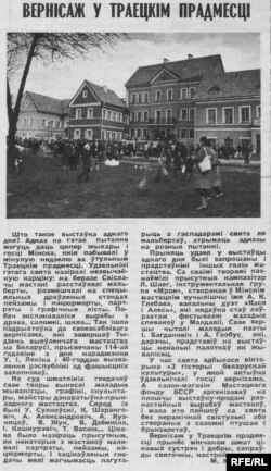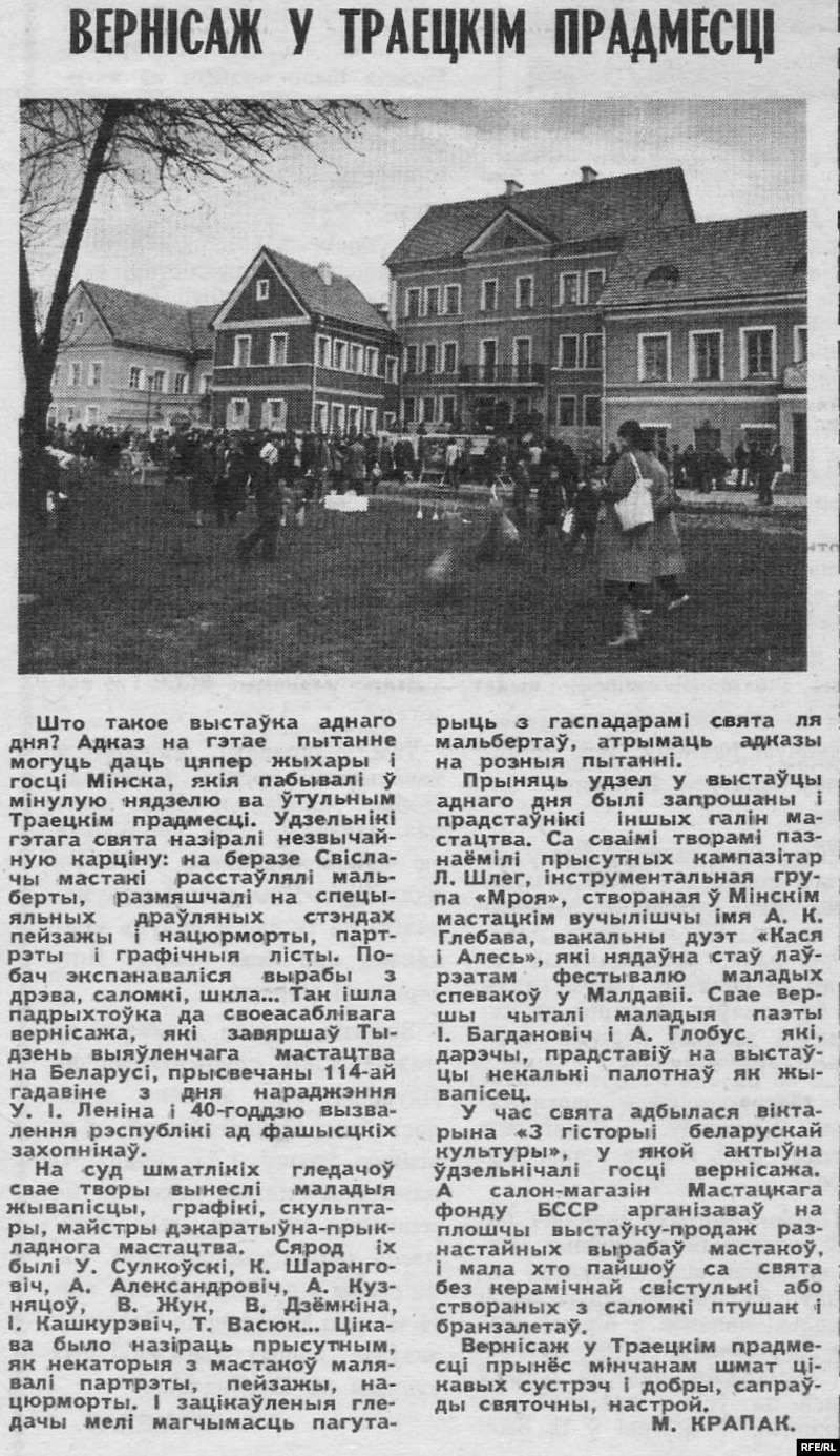 І яшчэ Майстроўня зрабіла перад войскам абсалютна эпахальную для нашага гораду і для нас акцыю – гэта выступ на сьвяце мастацтва ў Траецкім прадмесьці. Гэта было, дай бог памяці, на Вялікдзень. 1984 год. Таму што нас забрылі акурат праз два месяцы пасьля гэтага. І мы стаялі на гаўбцы ў Траецкім і “бамбілі” сваю ўжо больш нармальную, цалкам накатаную праграму. І тут зьбеглася ўся гэтая нефармальная абшчына траецкая глядзець на гэтых монстраў, якія валасатыя, фарбаваныя нешта граюць па-беларуску.