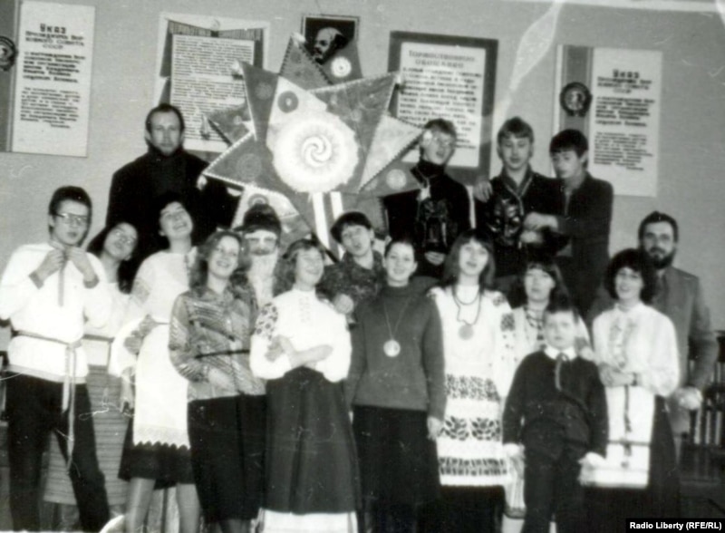 Майстроўня ладзіць Каляды ў беларускай клясе менскай СШ № 108, 29 сьнежня 1983 году. Верхні шэраг: Рыгор Панцялееў, Гэнік Лойка, Яўген Валасевіч, Алесь Костка. Ніжні шэраг: Вінцук і Арына Вячоркі, Віялета Ефіменка (Кавалёва), Люся Капітула, Алесь Істомін у масцы Каляднага дзеда, Алена Клімовіч, Аліна Садоўская (Барысевіч), дзяўчына-сакратарка БДТМІ, Марына Лычкоўская, Юля Лыскова з малодшым братам Антонам, Югася Касянюк (Волкава), Сяргей Запрудзкі.