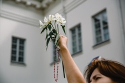 На чале хрэснага ходу ішлі трое сэмінарыстаў і дыякан архікатэдральнага касьцёла Юры Рашатко. Гэта малітоўная акцыя. Яны вераць, што з дапамогай малітвы можна спыніць гвалт, які чыніцца ў краіне.